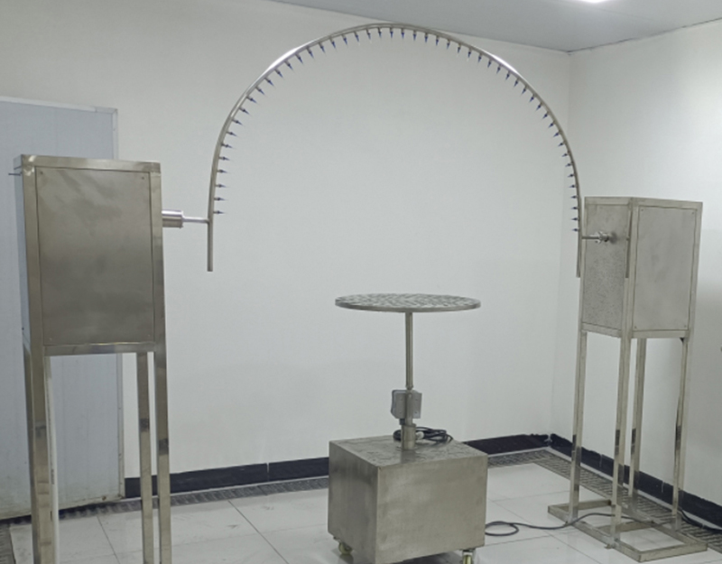 样品放置:将样品放在试验台上面,使其喷水口的距离样品表面约200mm,试验转台不旋转。 试验条件:摆管夹角120°喷水孔喷水喷向样品。样品放在摆管半圆中心。挥管两边各摆动60°,共120°。每次摆动(2×120°)约4s。