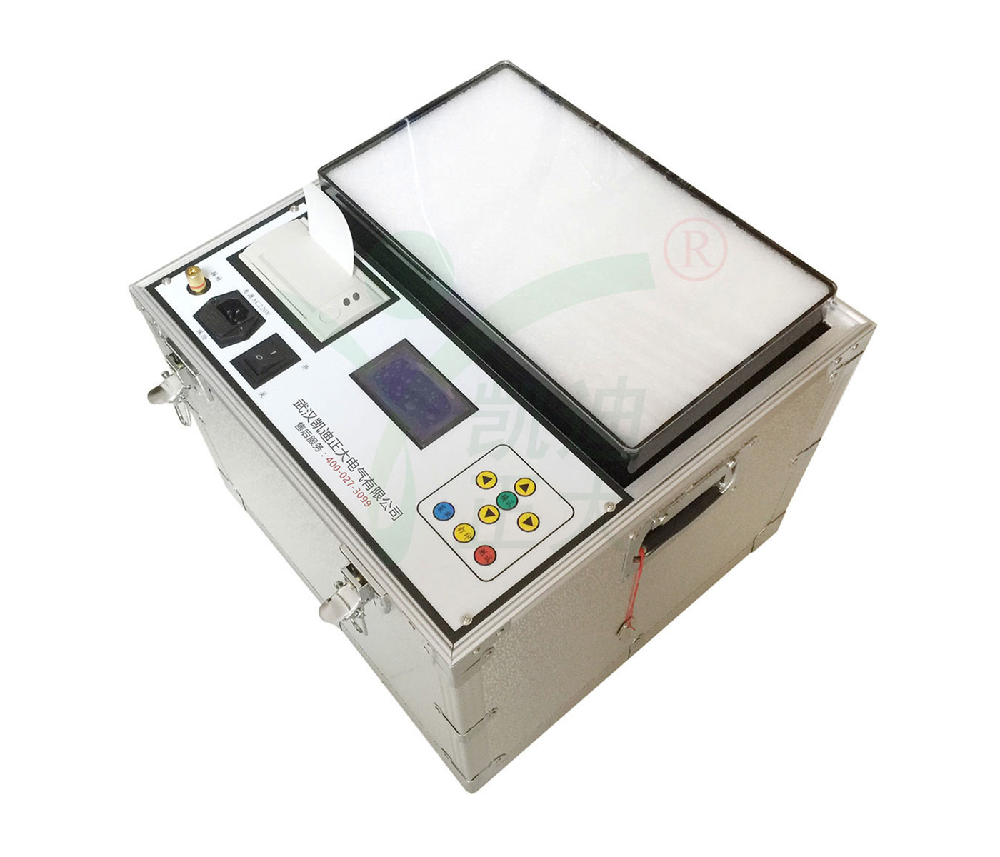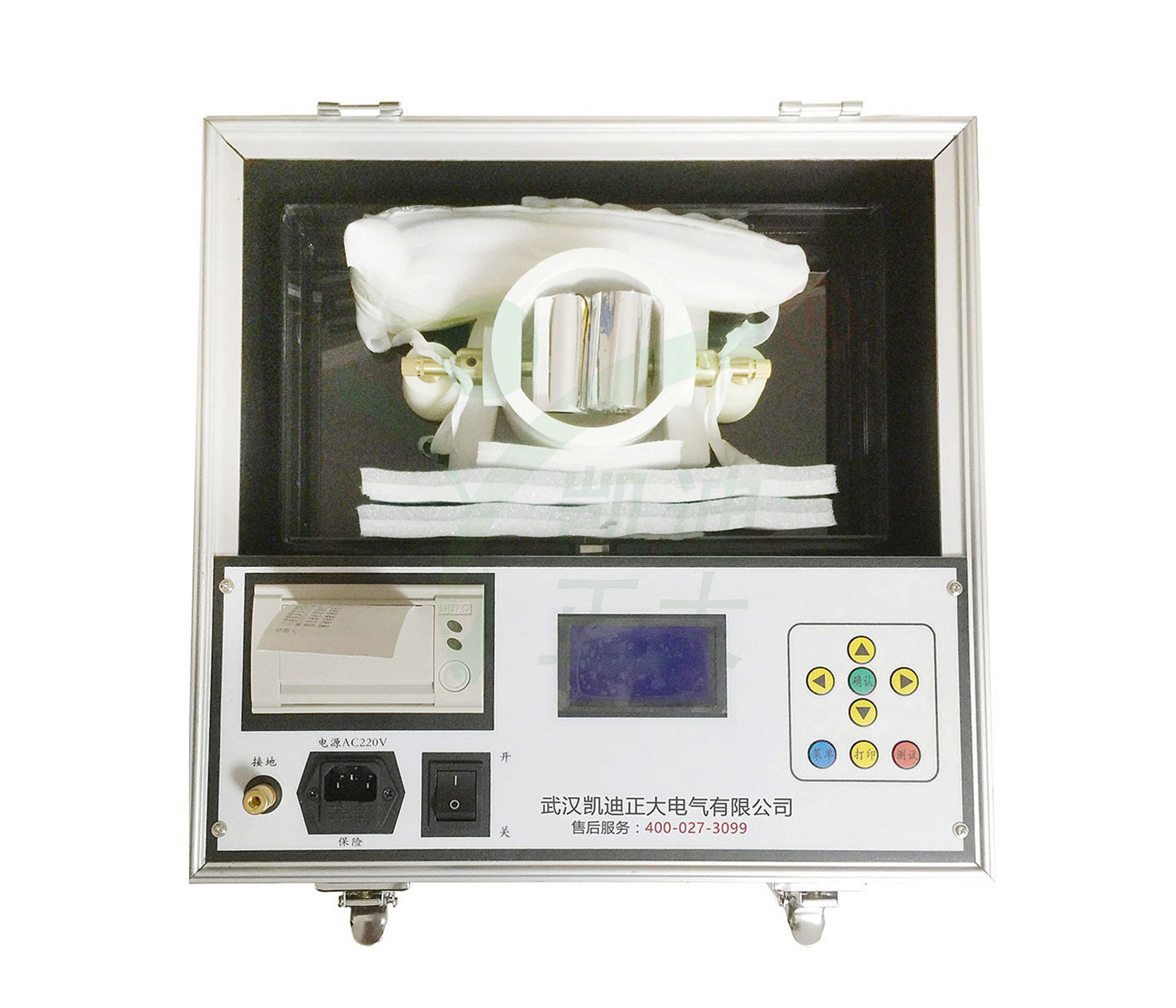 3.本仪器操作简单,操作人员只需进行简单的设置,仪器将会按照设定自动完成油样的耐压试验。1~9次的击穿电压值和轮回次数会自动存储,试验完成后可直接用微型TPU-A面板式打印机,自动打印输出。